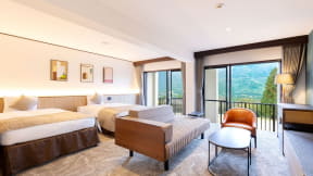 仙石原の自然に囲まれた大人の隠れ家的温泉リゾートで、伝統工芸の寄木細工から着想を得たモダンな空間が特徴。大浴場や露天風呂からは空と森が溶け合うような景色が楽しめ、客室もすべてフォレストビュー。