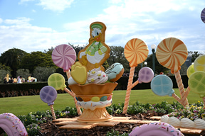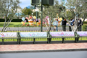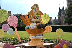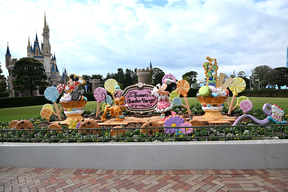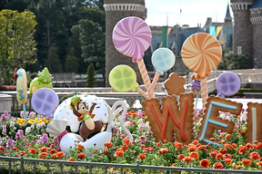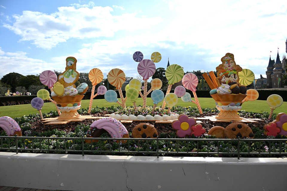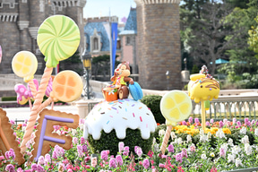 また、シンデレラ城前プラザの花壇にも、ディズニーの仲間たちをモチーフにしたロリポップのデコレーションがあしらわれている。