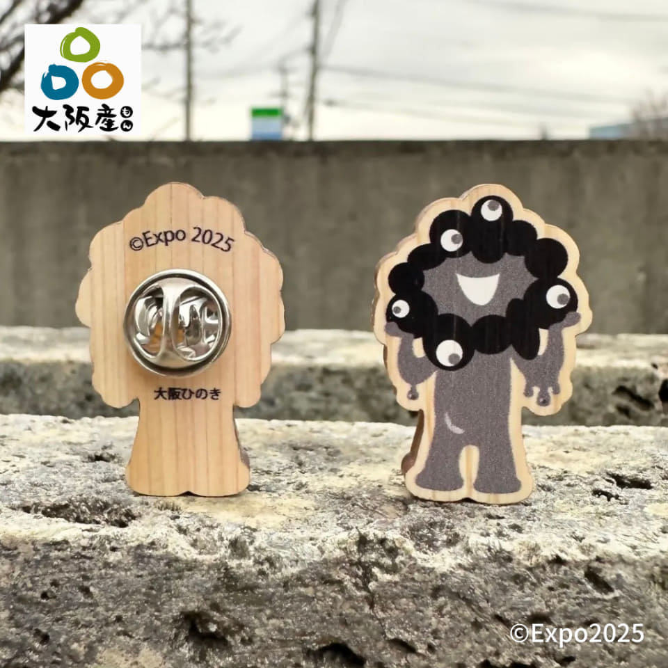 大阪府産ひのきを使用した木製バッチで、万博公式キャラクター「ミャクミャク」をブラックカラーで表現した特別仕様。サイズは約23×34mm(幅×高さ)で、厚みは約5mm。