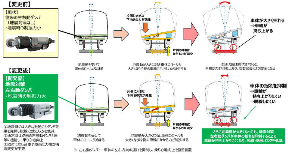 ダンパは台車と車体の接続部に設置され、振動を減衰させる効果がある。ただし従来製品は主に乗り心地の向上を目的としており、地震による振動は吸収しきれず車輪が持ち上がって脱線するリスクがあった。