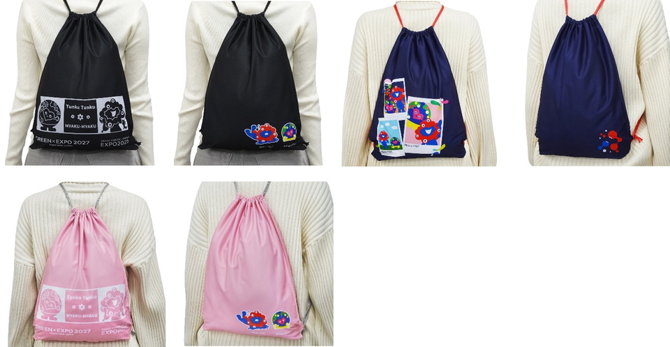 ・EX27 TK【ミャクミャク】ナップザック 黒/ネイビー/ピンク(各1980円)