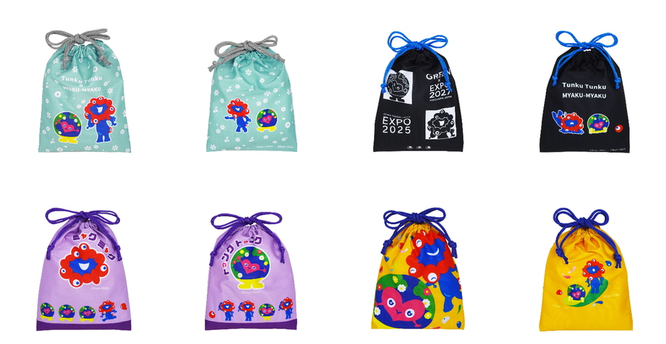 ・EX27 TK【ミャクミャク】巾着 ミント/黒/パープル/オレンジ(各880円)