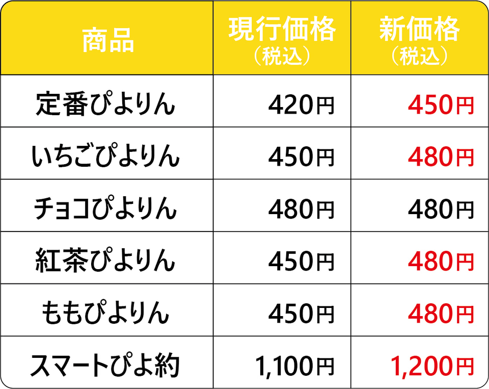 店頭販売分とJR名古屋駅での無人受け取りサービス「スマートぴよ約」の5商品が対象。通常ぴよりんといちご・紅茶・ももぴよりんは30円値上げ(420円/450円→450円/480円)、2羽+ステッカー入りの「スマートぴよ約セット」は100円値上げ(1100円→1200円)となるが、「チョコぴよりん」は価格据え置き(480円)としている。