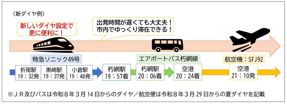 例として、スターフライヤーのSFJ81便(羽田~北九州)から小倉方面に乗り継ぐ場合、改正後は北九州空港での乗り継ぎ時間が15分、朽網駅での乗り継ぎ時間が5分短縮。列車時刻の兼ね合いも含め、小倉駅には現行から26分早く到着できるようになる。