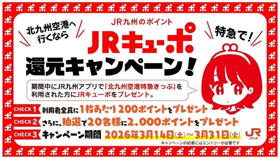 期間中、JR・バスの乗車券類がセットになった「北九州空港特急きっぷ」をアプリから利用した人にもれなくJRキューポ200ポイントを付与するほか、抽選で20人にさらに2000ポイントをプレゼントする。参加にはWebサイトからのエントリーが必要。