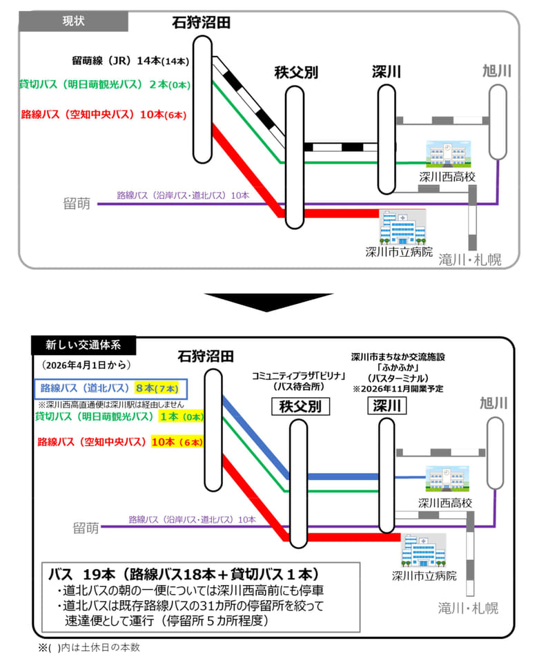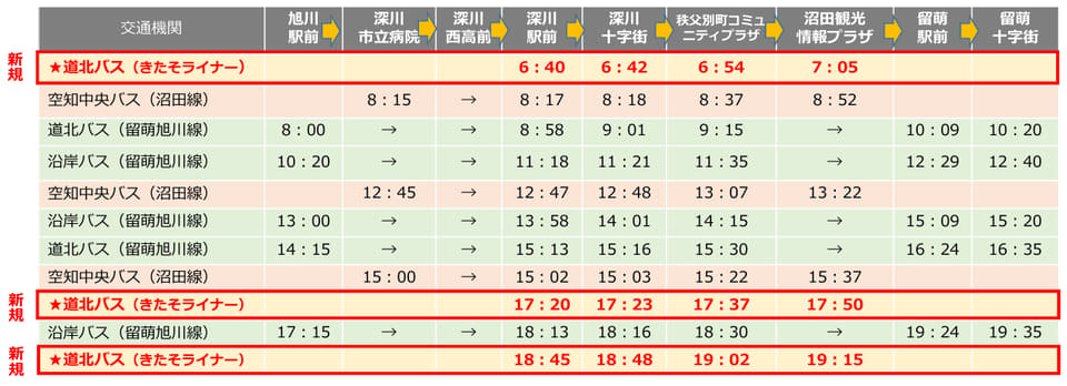 現在は並行して空知中央バスが沼田線(深川市立病院前~沼田駅前)を運行しているが、4月からはこれに加え、道北バスが速達路線の沼田深川線(きたそライナー号)を新設する。また新しいのりばとして、深川エリアではまちなか交流施設「ふかふか」(11月開業予定)、秩父別エリアではコミュニティプラザ「ピリナ」(4月開業予定)をそれぞれ設ける。