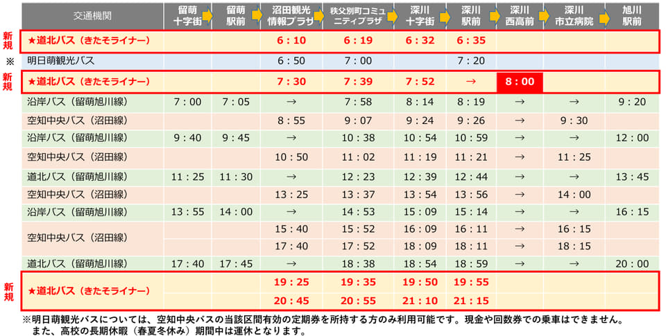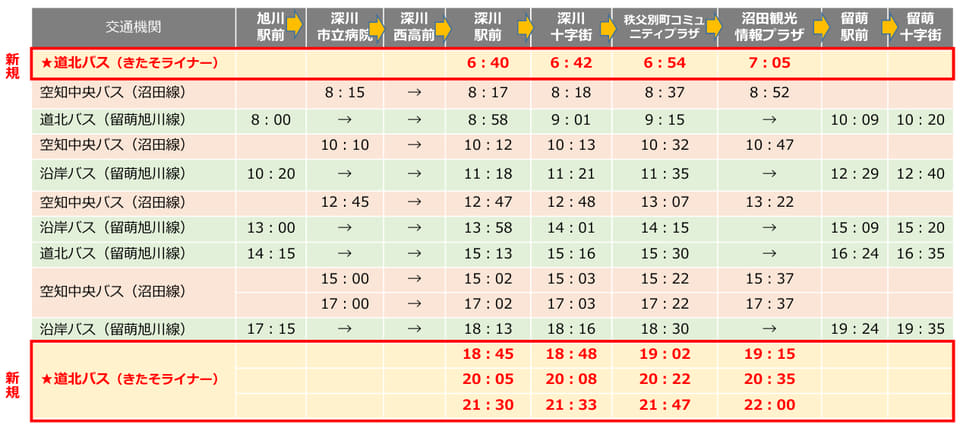 「きたそライナー号」には新型車両を投入し、黄色と緑色を基調としたラッピングを施して運行。バスロケーションシステムやタッチ決済による運賃支払いも導入する。深川駅前~沼田観光情報プラザ間の運行を基本とするが、平日朝の深川方面1本は深川駅前を経由せず深川西高前行きとして運行する。