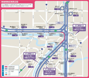 中央環状線では、内回りの堀切JCT付近から小菅JCT付近までの区間で左車線を規制する。実施時間は当日6時~翌6時。