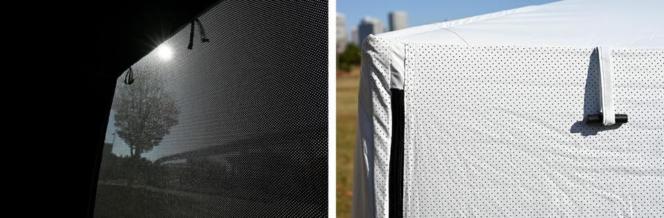 ポールの組み立てがなく、傘のように広げるだけで設営できる「パッとサッとキューブ」シリーズからは、新モデルとして「ライト シースルー」が登場する。