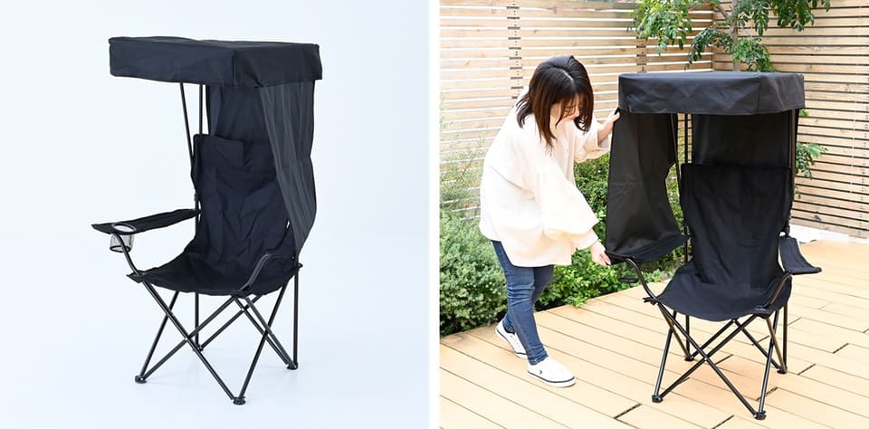 上部を覆うシェードとサイドシートが付いた「シェード付きチェア」は、イベントや作業現場での日差し対策に便利。生地はUPF50+・遮光率99.99%のスペックで、シェード・サイドシートは取り外して使うこともできる。参考価格は3980円。