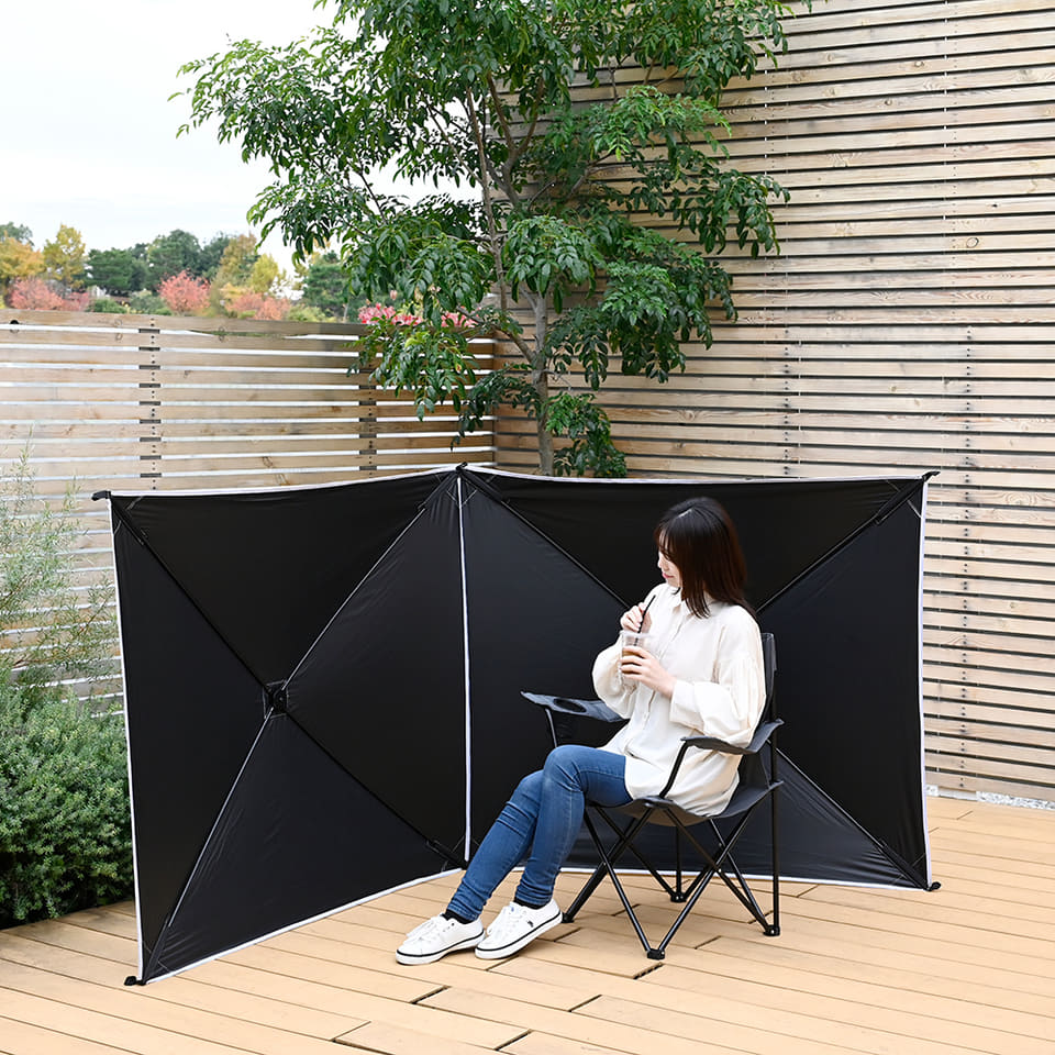 正方形2面がつながった形状の「アタッチメントタープ(ブラックコーティング)」は、約272×120cmというサイズ。2面を自立させて目隠しにしたり、山型に立てて日除けにしたり、クルマに立て掛けてカーサイドタープにしたりと、さまざまな使い方ができる。既存のシルバーに続く新色で、ブラックはUPF50+・遮光率99.99%となっている。参考価格は5980円。