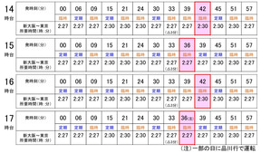 加えて、東京駅~新大阪駅間を2時間30分で運転している一部列車は所要時間を3分短縮。なお、新大阪駅17時台発の13本目となる「のぞみ」は、一部の日で東京行きではなく品川行きとなる。