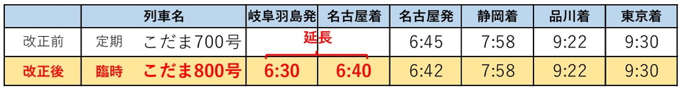 さらに名古屋駅からの「こだま」始発列車「こだま700号」は、利用者の多い日に限り、岐阜羽島駅始発の臨時列車として延長運転する。
