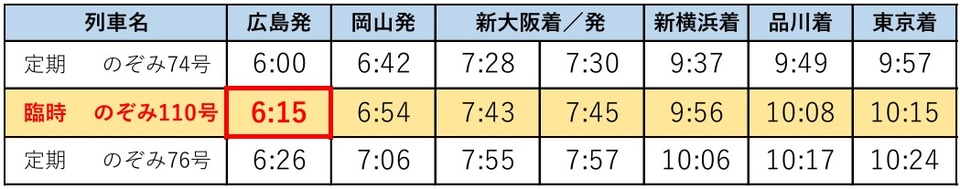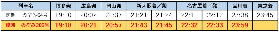 このほか博多駅からは、現行の東京行き最終列車よりもあとに品川行きの臨時「のぞみ206号」を設定し、沿線での滞在可能時間を拡大。東京駅~新大阪駅・岡山駅間の「のぞみ」1往復は、特定日に広島駅発着に延長する。