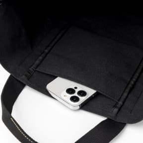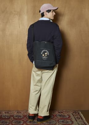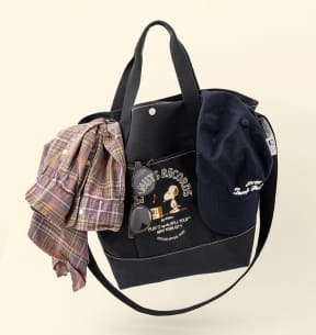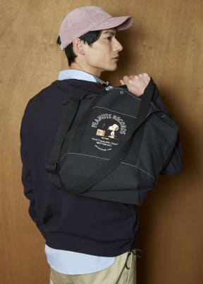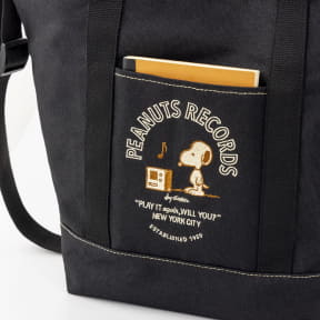 ブラックの生地にアクセントとなるベージュのステッチと、フロントポケットに施したスヌーピーの刺繍が、大人カジュアルながらクラシックな雰囲気をかもす舟形トートバッグ。サイズは約44×16×35cm(幅×奥行×高さ)。