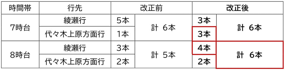千代田線では、9時台から移すかたちで平日7時台の綾瀬方面行きを1本増発。土休日の7時~8時台には北綾瀬始発の綾瀬行き2本を代々木上原方面行きに延長し、さらに綾瀬行き1本を増発する。