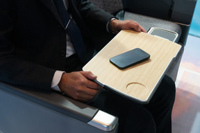 写真でも分かるようにリクライニング量拡大の効果は大きく、しっかり“眠れる”角度まで倒れてくれる。シートピッチも広がったので、前席がフルリクライニングしてもまだ余裕があり、テーブルに飲み物やタブレットなどを展開してもそのまま利用できそうだった。