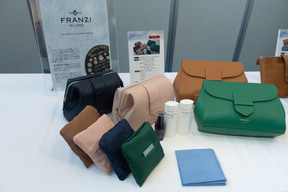 会場には4月から順次導入のはじまるイタリア・ミラノの革製品ブランド「FRANZI(フランツィ)」とコラボしたアメニティキットのサンプルも展示してあり、一見して(手触りも)本革に見えるリサイクルポリエステルの質感も試すことができる。