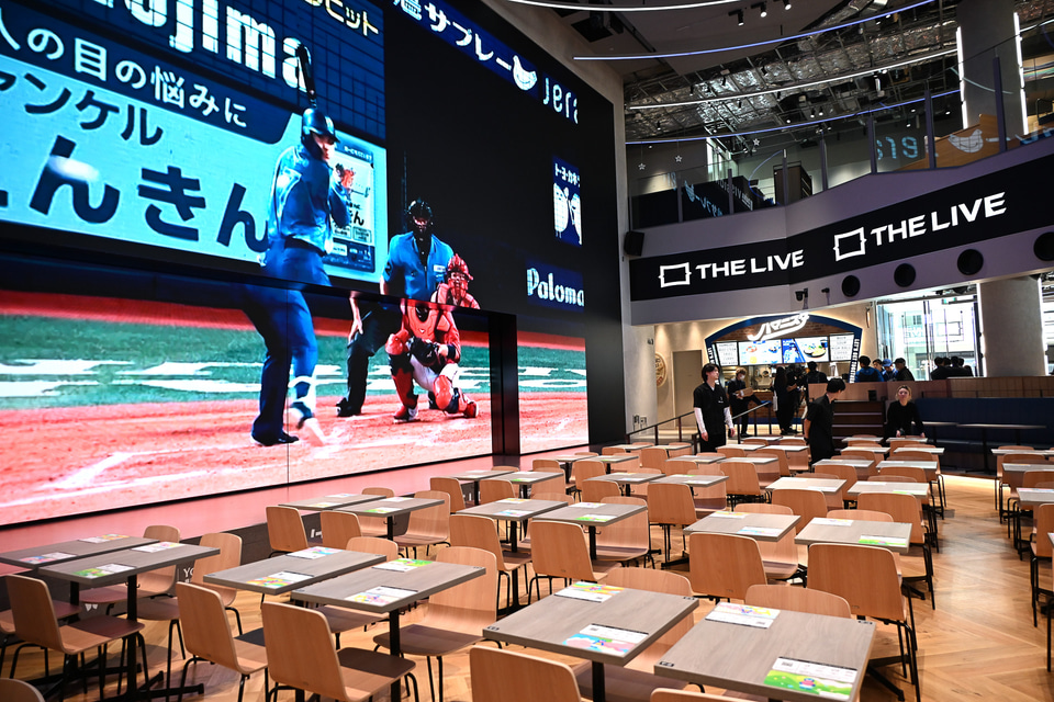 本稿で紹介するのは、街区中央の「THE LIVE Supported by 大和地所」。国内最大級のビジョンでスポーツ観戦の興奮を体感できるライブビューイング施設で、横浜DeNAベイスターズ球団公式試合からビジターゲーム、サッカー、バスケ、さらに音楽ライブまで幅広く放映する。エンターテイメントと食が融合し、誰もが一体感を感じられる空間を目指すという。