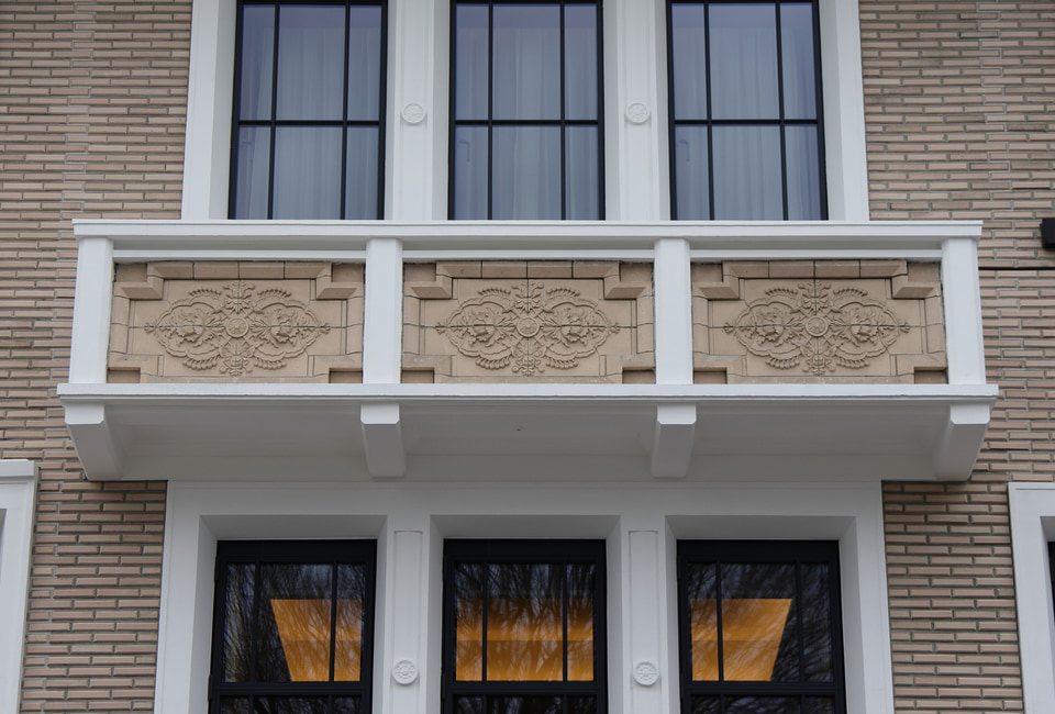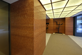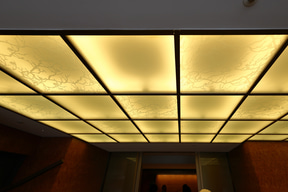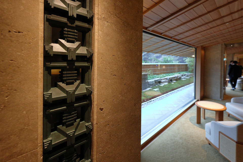 また、柱の材質や装飾、調度品や館内飾られている美術品もそれぞれに「弥栄会館」「帝国ホテル」「京都」といったキーワードでこだわって選定している。例えば、ラウンジの柱に埋め込まれた装飾はライト館(旧帝国ホテル)で使っていたテラコッタデザインの鋳物をあしらっており、テーブルは弥栄会館時代に流行したというアール・デコ様式の多角形のデザインを採用している。