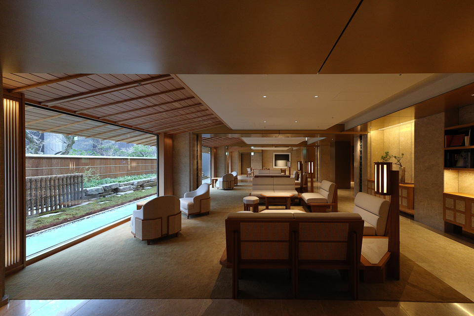 宿泊者ラウンジはエントランスからドアを隔てた奥にあり、照明も控えめで、宿泊者がゆっくりとくつろげる空間としている。弥栄会館の外壁を残した設計のため吹き抜け構造にできなかったので、天井高は現在のホテルとしては低いが、水平方向に広がって見える空間構成としているとのこと。また、大きな窓に向かって掛込天井を傾斜させ、窓の外の庇へと続くように見せることで内外の境を曖昧にしており、広い縁側にいるような雰囲気を演出している。