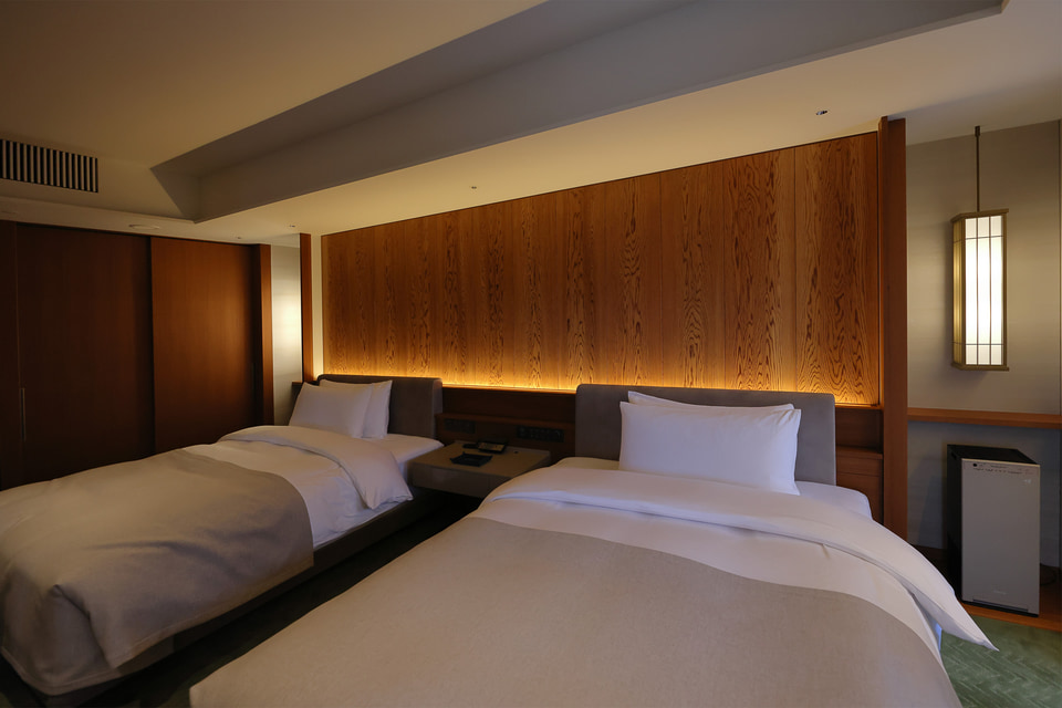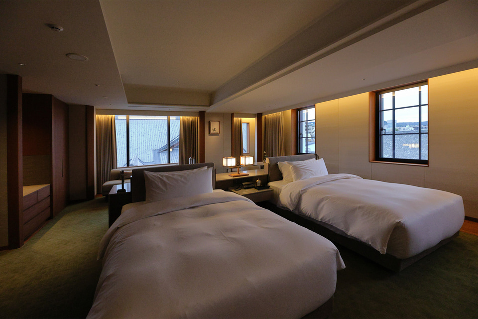 客室は全12タイプ55室。すべての部屋が50m2以上で、ゆったりとした広さが最大の特徴だ。ラグジュアリーホテルだが決して内装は華美ではなく、国産の木材や壁土を使用し、また調度品や工芸品もさりげなく飾られている。帝国ホテルらしい伝統と格式を重視し、また京都らしい静けさや清潔さが感じられるしつらえである。