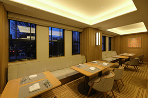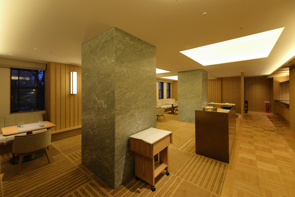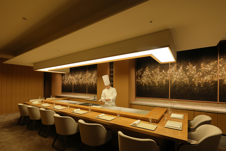 帝国ホテルが受け継いできたフランス料理をもとに、京都の風土と向き合い、二十四節気の移ろいを表現したメニューを提供する。カウンターは料理人の所作、調理の熱、料理の香りを間近で感じられ、料理を五感で楽しめる。