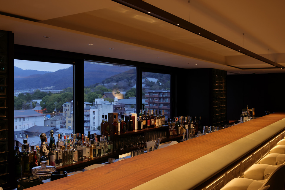 “帝国”の名を冠したクラシカルなオーセンティックバー。壁面はライト館を思わせる装飾がなされ、伝統と格式が感じられる。カウンター越しに京都の街並みと東山、北山、比叡山を一望できる。帝国ホテルで100年以上提供し続けてきたオリジナルカクテル「マウント フジ」をベースに、抹茶や柚子など京の素材を加えて完成させた「マウント 比叡」は帝国ホテル 京都限定。