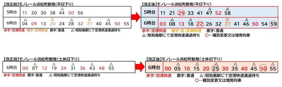 流通センター駅、大井競馬場前駅、天王洲アイル駅では、平日・土休日ともに上り始発列車の時刻を8分早める。これにより、早朝時間帯の浜松町駅での乗り換えが便利になる。