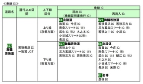NEXCO中日本 金沢支社は、舞鶴若狭自動車道(E27)上下線の若狭美浜IC~敦賀JCT間で昼夜連続通行止め、小浜IC~若狭美浜IC間で夜間通行止めを4月13日0時~18日6時の期間実施する。夜間通行止めの実施時間は各日20時~翌6時。