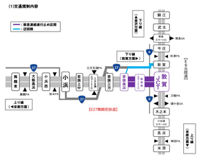 道路構造物の点検・清掃、舗装補修工事、橋りょうの床板防水工を行なうため。期間中は並走する国道27号などへのう回を呼びかけており、利用区間に応じて乗継料金の調整を行なう。