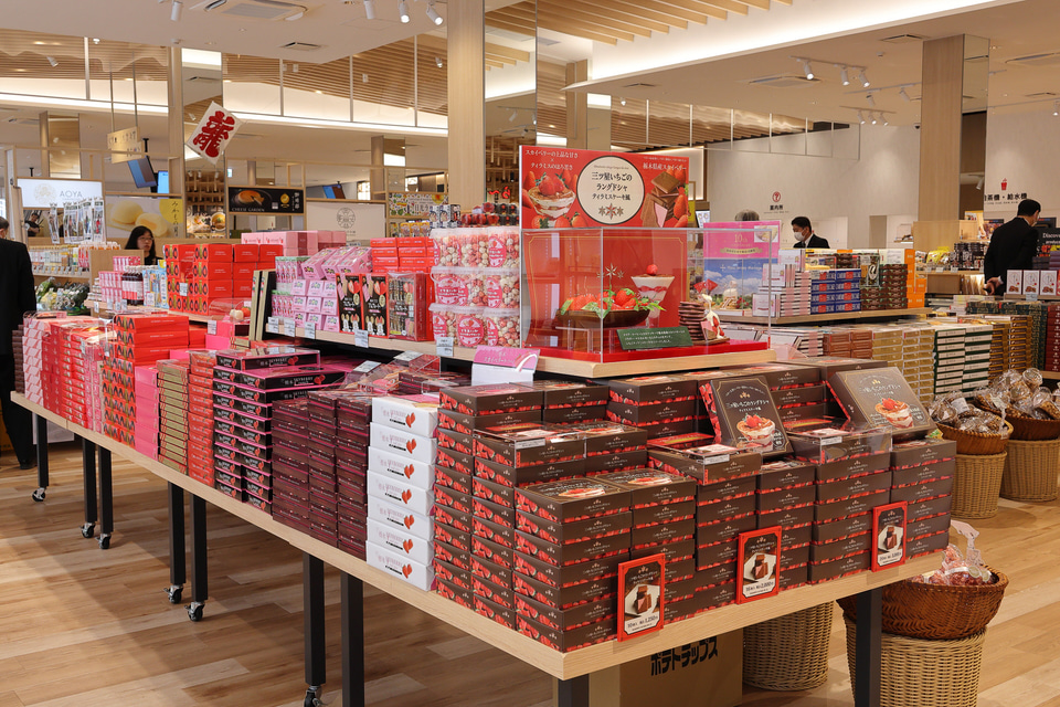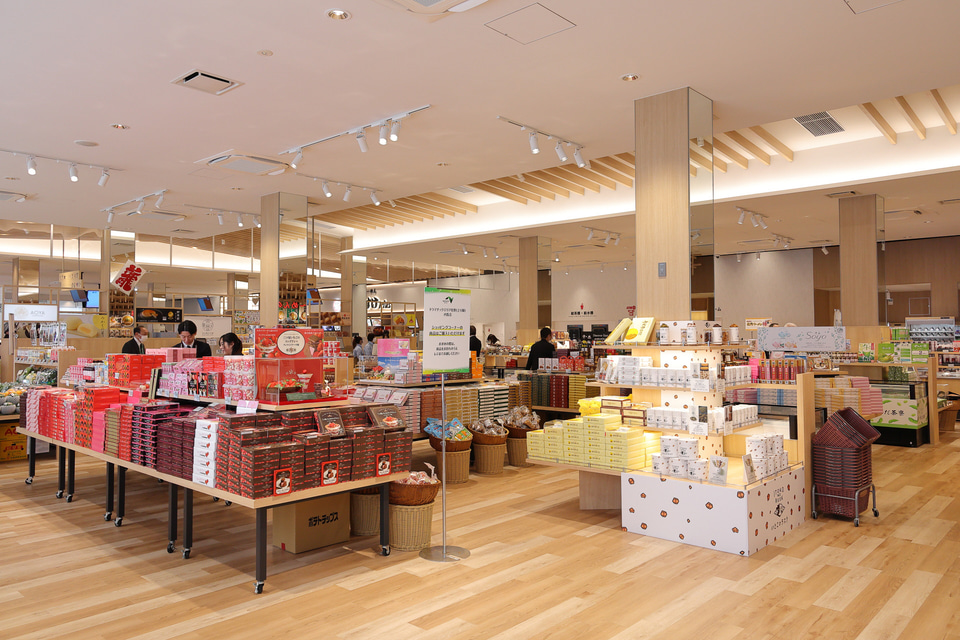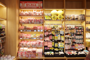 飲食店に負けない充実ぶりのショッピングコーナーには、地域の名産品が揃っていてこちらも楽しい。佐野ラーメン土産が勢揃いした「らーめんウォール」をはじめ鬼怒川金谷ホテル直営の「金谷菓子本舗」や小山市の老舗和菓子店「蛸屋」、宇都宮や佐野の餃子など地域に根ざした商品の数は圧巻。