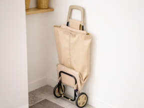 駅の自動改札をスムーズに通れて、電車の座席でも邪魔にならない縦型スリムの軽量折りたたみカート。使わないときは折りたたんでコンパクトに収納できる。寝かせて荷積みができるセンターファスナーを採用している。