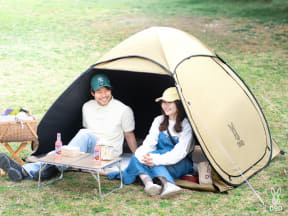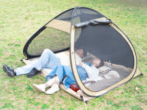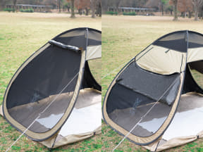 すばやく設営できるポップアップ式のテントで、内側にはUPF50+、遮光率99.9%以上のブラックコーティングを施す。側面と天井のメッシュ窓で通気性も高め、「入った瞬間に分かる涼しさ」を実現した。