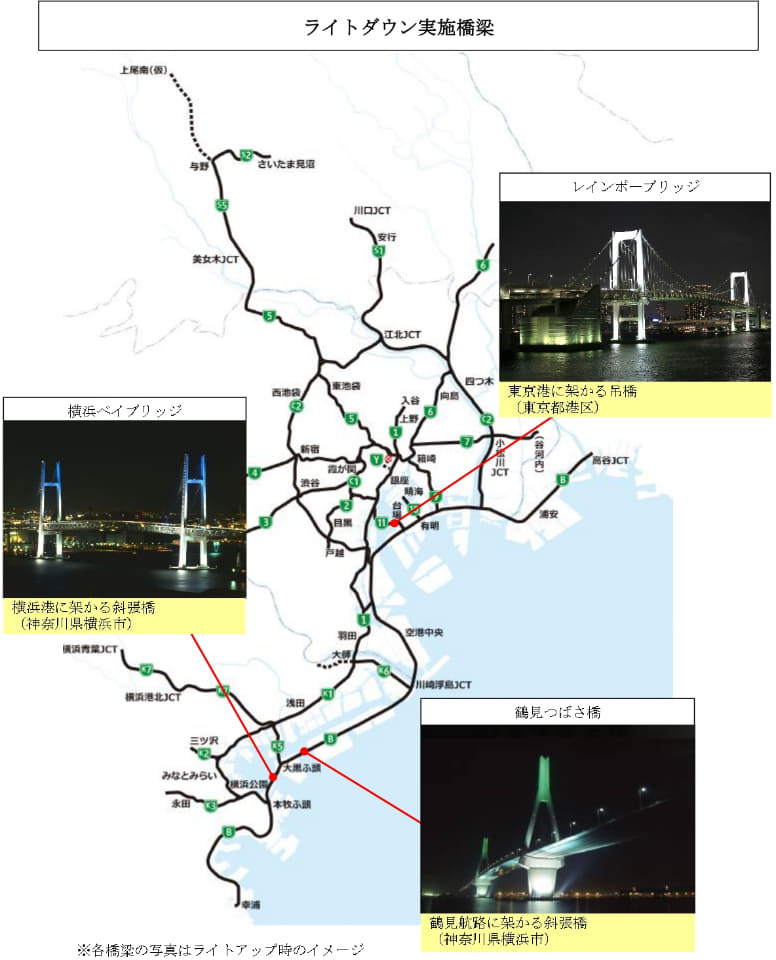 首都高速道路は、3つの橋(レインボーブリッジ、横浜ベイブリッジ、鶴見つばさ橋)のライトダウンを3月28日20時30分~21時30分に実施する。