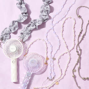 コーディネイトのアクセントにもなるネックストラップとハンドストラップは、ラメ×透明感でトレンド感たっぷりのフリル、夏の光に映える透明オーロラ、かわいらしさをプラスするパールなど、種類豊富にラインアップ。価格は各1300円~2000円。