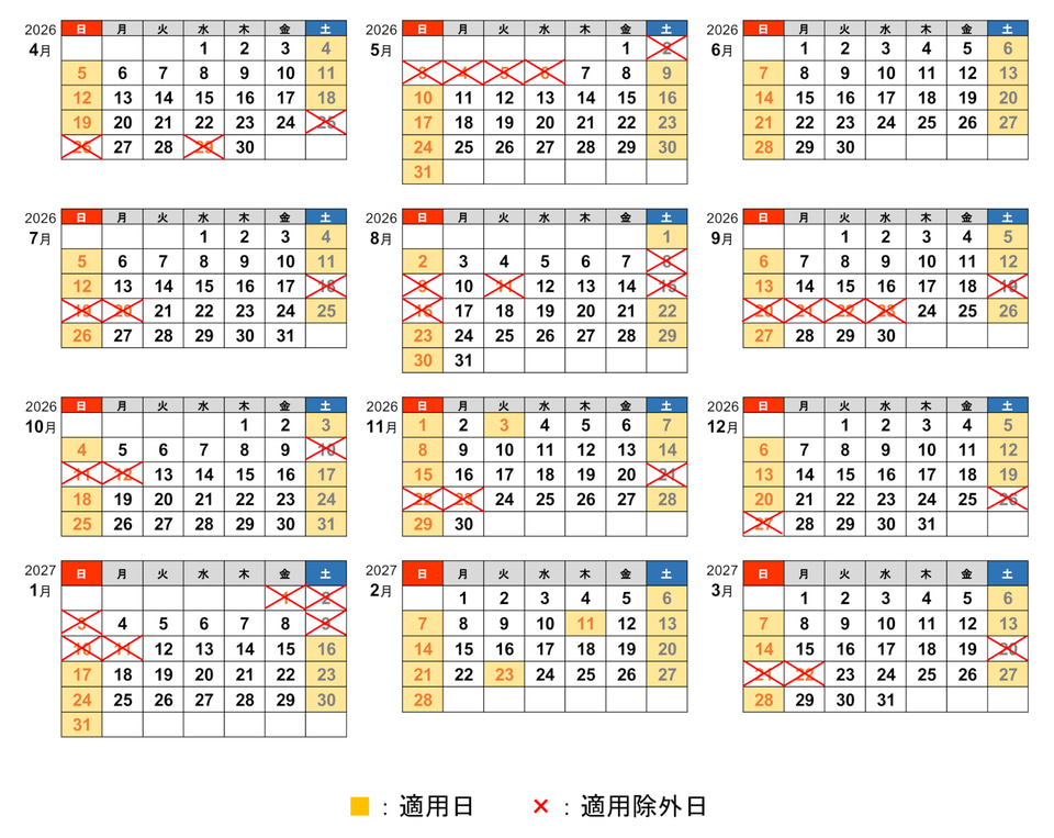 観光需要の平準化や交通分散を目的に混雑期の休日割引は適用除外が続いているが、2026年度についてもこの方針を継続。ゴールデンウィーク、お盆、年末年始、シルバーウィーク、3連休が休日割引の対象外になる。