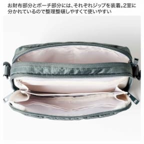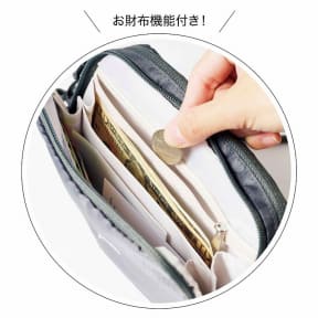 お財布部分には、4枚分のカードポケット、チケットなどを収納できる仕切り、小銭入れ、お札スペースを搭載。ポーチ部分には、使用頻度の高いハンドクリームやリップ、タオル類などを入れておける。
