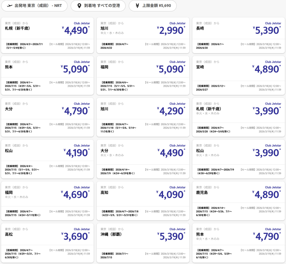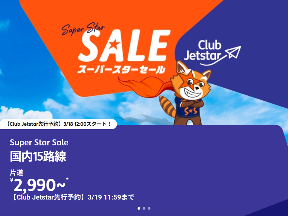 ジェットスター・ジャパンは、「スーパースターセール」を3月19日12時〜25日16時59分に実施する。有料会員プログラム「Club Jetstar」の会員は、18日12時から先行予約が可能。