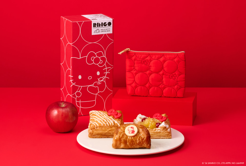 今回のコラボでは、ハローキティの限定グッズをセットにした商品3種と、フィナンシェ缶1種の計4商品を展開。いずれもコラボならではのデザインで、“とっておき”をテーマにした仕上がりとしている。各セットには、ハローキティ仕様のパイ3種が共通で付属する(単品販売なし)。またいずれも「RINGO」国内常設店舗で販売し、なくなり次第終了とのこと。