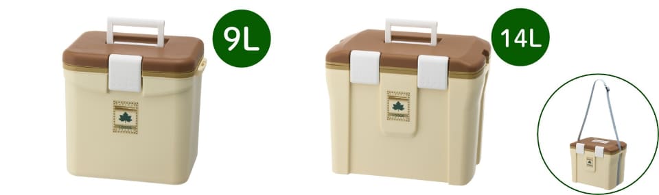 14Lサイズはフタを完全に取り外せる仕様で、中身の出し入れや使用後の手入れ、庫内の掃除がスムーズに行える。いずれのサイズも持ち運びに便利なハンドルに加え、肩掛けベルトが付属している。