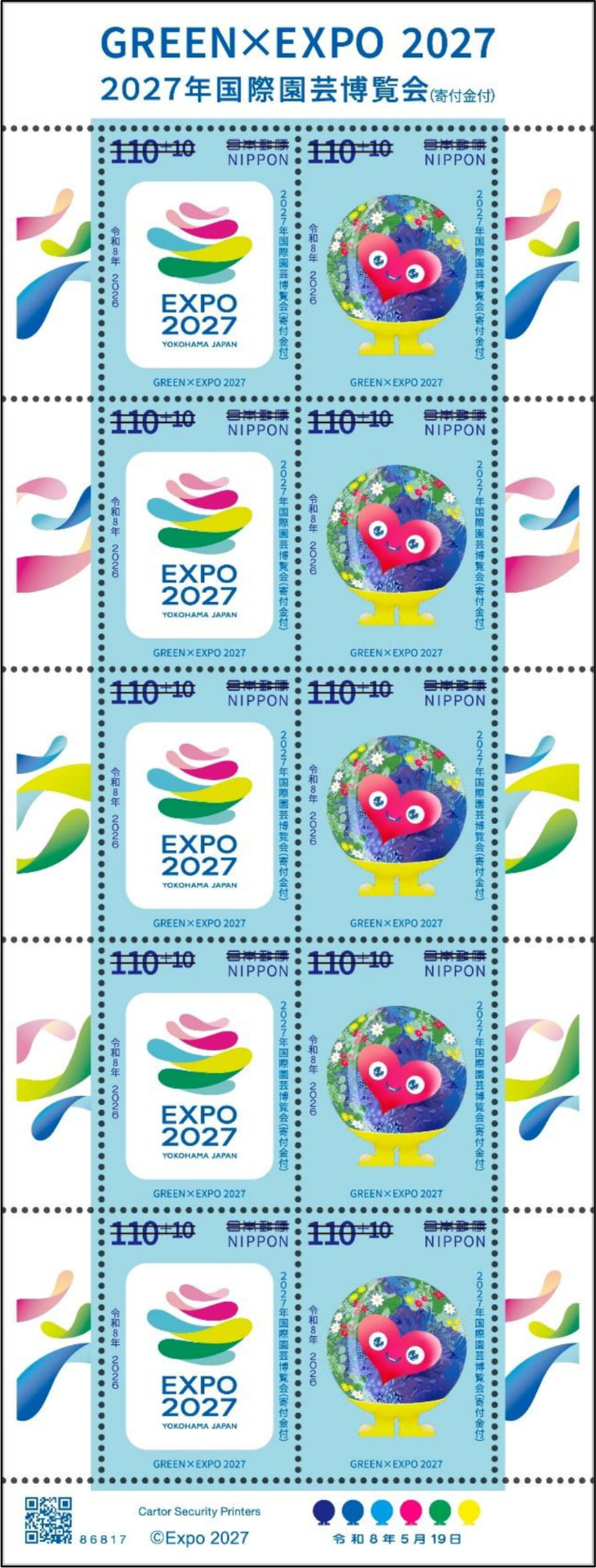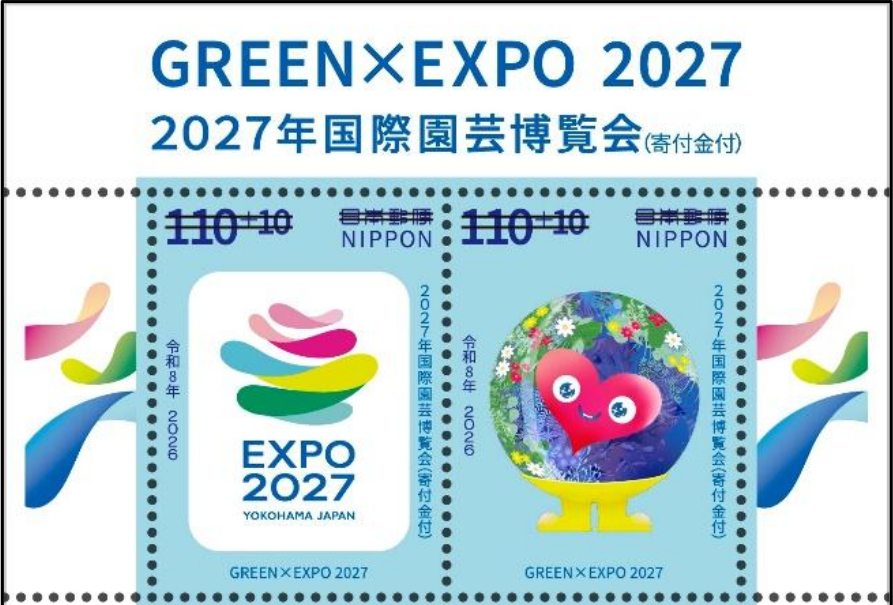 また、2026年5月19日9時~7月21日の期間限定で、特殊切手「2027年国際園芸博覧会(寄付金付)」の販売が決定。デザインは公式ロゴマークとトゥンクトゥンクの2種類・各5枚の110円切手がセットになっており、価格は1シート1200円。1枚120円で枚数単位での購入も可能。