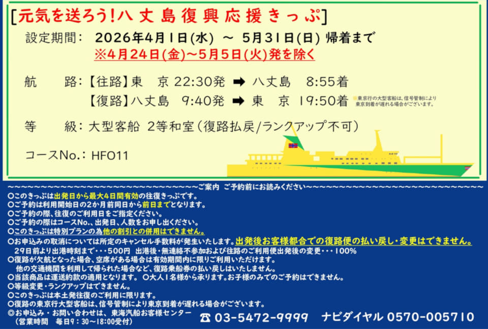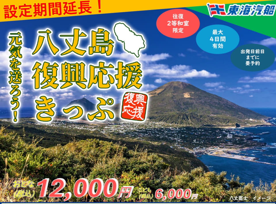 東海汽船は、「元気を送ろう!八丈島復興応援きっぷ」の販売を5月末まで延長する。