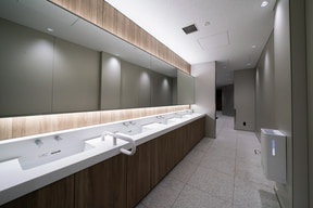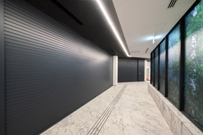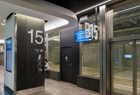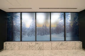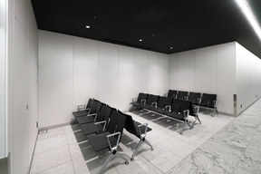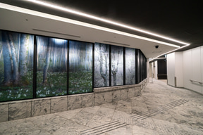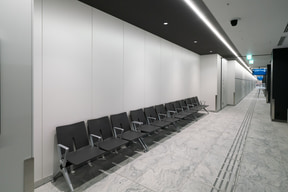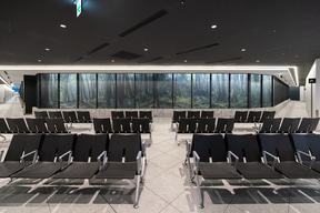 待合と車路を隔てるガラスの壁面には、日本の四季折々の自然風景写真が一面に貼られ、地下という閉塞感を感じることのない居心地のいい空間が広がっている。待合スペースも、空間には極力イスを設置しようとした工夫が見受けられる。