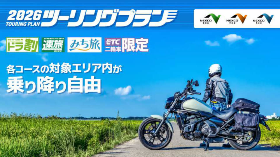 NEXCO 3社と宮城県道路公社、京都府道路公社、兵庫県道路公社は、ETC搭載の二輪車限定「ツーリングプラン」全22コースを2026年度も販売する。利用期間は4月1日~11月30日(北海道は10月31日まで)。