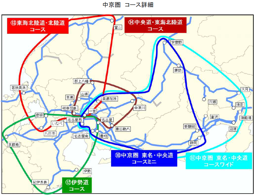 対象エリア: 東名、名神、新東名、伊勢湾岸道、長野道、中央道、中部横断道、名二環、東富士五湖道路、東海環状道