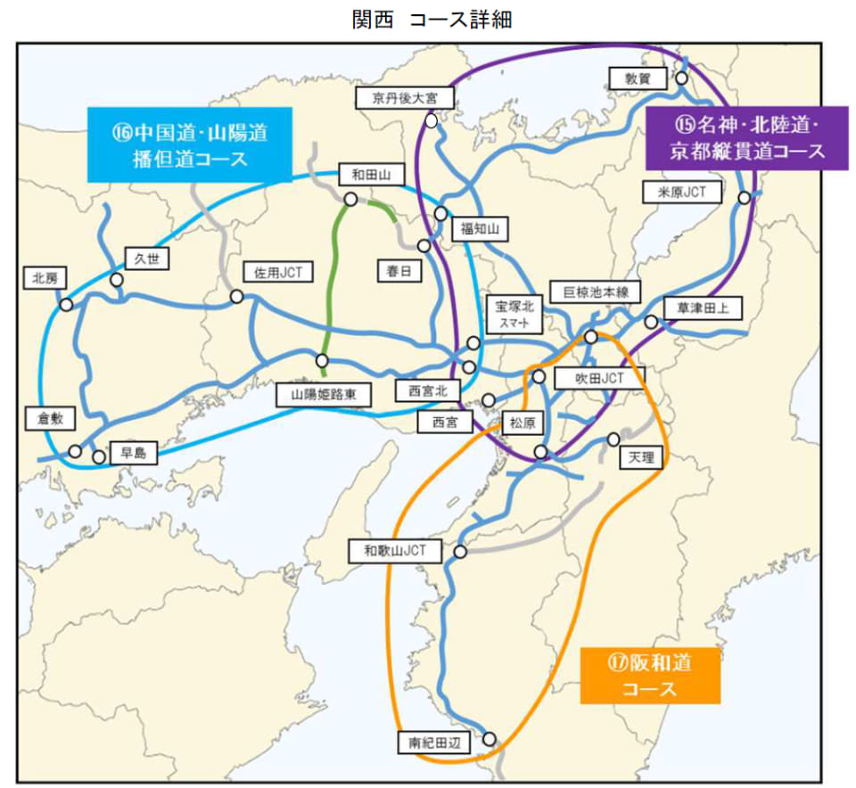 対象エリア: 名神、新名神、中国道、北陸道、京都縦貫道、山陰近畿自動車道、京奈道路、近畿道、舞鶴若狭道、京滋バイパス、第二京阪道路、第二阪奈道路