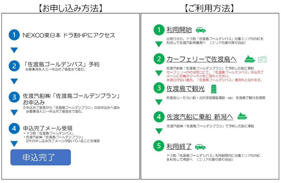 カーフェリーの対象航路は新潟~両津航路、直江津~小木航路で、車両航送代(3m以上6m未満)を含む。佐渡島ゴールデンパスとセット利用することで、宿泊あり・なしどちらのプランでも1000円引きになる。
