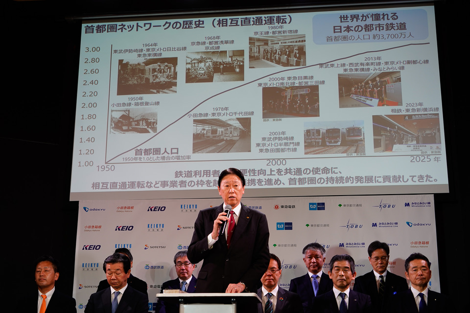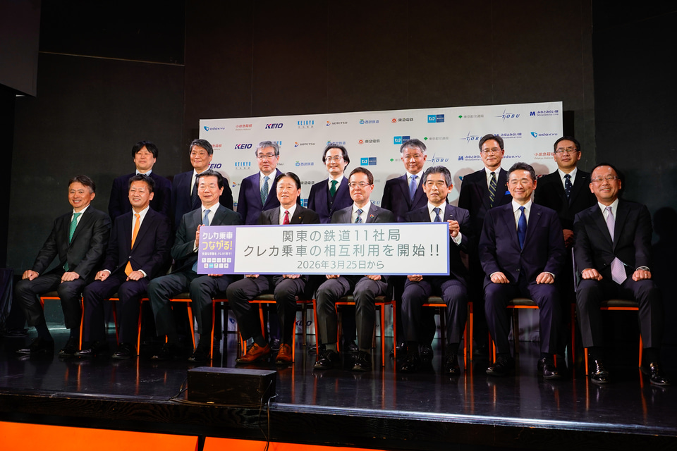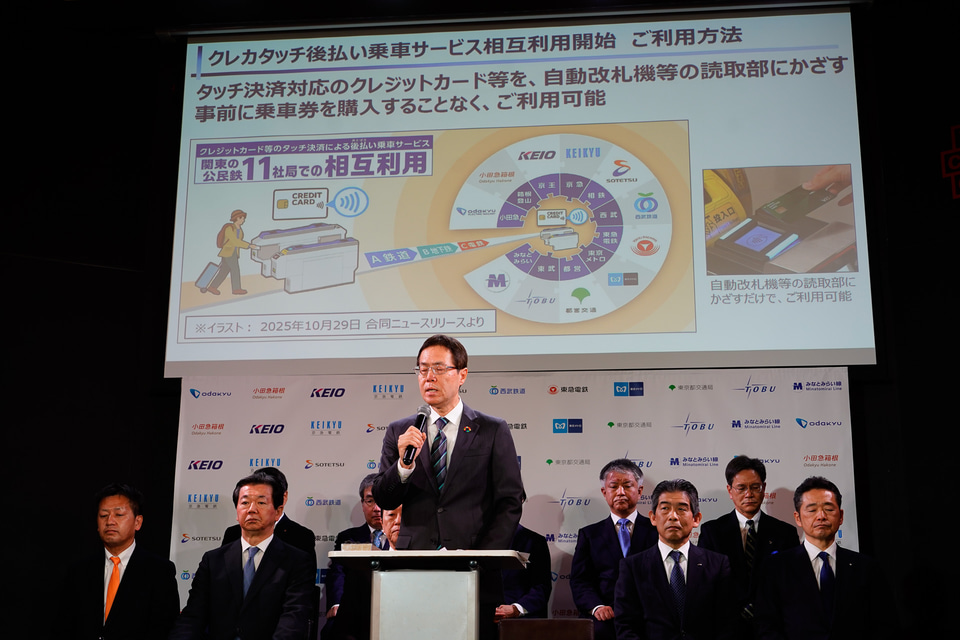 関東の鉄道11社局は3月25日、クレジットカードのタッチ決済による後払い乗車の相互利用を開始した。それに合わせて、当日に報道関係者向けの発表と、駅でのデモンストレーションを行なった。