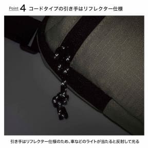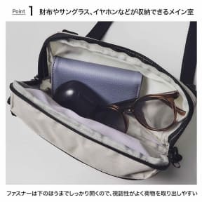 メイン室は財布やサングラス、イヤホンなど、お出かけの必需品がおさまるサイズ感。ファスナーは下まで大きく開くので視認性がよく、取り出しもスムーズ。また、ファスナー引き手はコードタイプで、暗い場所で反射して光るリフレクター仕様になっている。